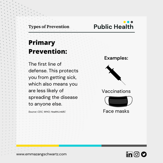 But, why are masks and vaccines the best option? A lot of it comes down to optimizing prevention methods, which reminded me about the types of prevention. Not all prevention methods are the same, and some are more impactful than others. Primary prevention intervenes sooner and has a bigger impact than secondary or even tertiary prevention methods. I break it down and give examples of the different types of prevention here.